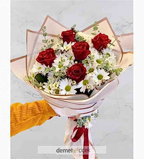 5 Kırmızı Gül ve Papatya Buketi